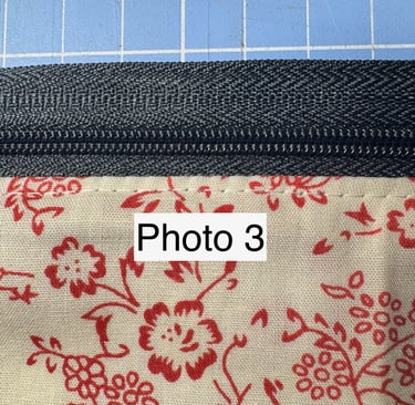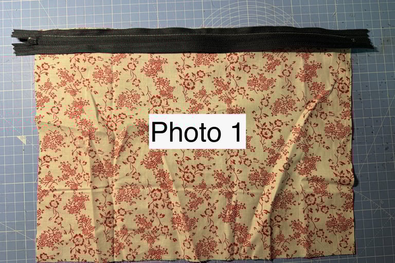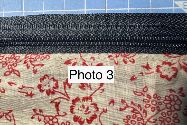 2. Line the zip face down with the top of the fabric and sew above the plastic zipper teeth. See Photo 1