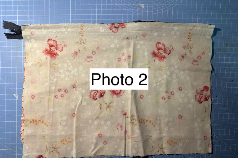 3. Lay another piece of fabric (for the inner side of the pouch) face down on top of the fabric you’ve just sewn the zip to. It needs to line up with the fabric underneath and should be lying on top of the fabric as it was in step 1. Sew along the fabric above the zipper teeth - you’ll have to feel where the zip is as it will now be covered with the lining fabric (inner pouch fabric). When more experienced, steps 2 and 3 could be sewn at the same time, with the zip like a sandwich between the two pieces of fabric. See Photo 2.